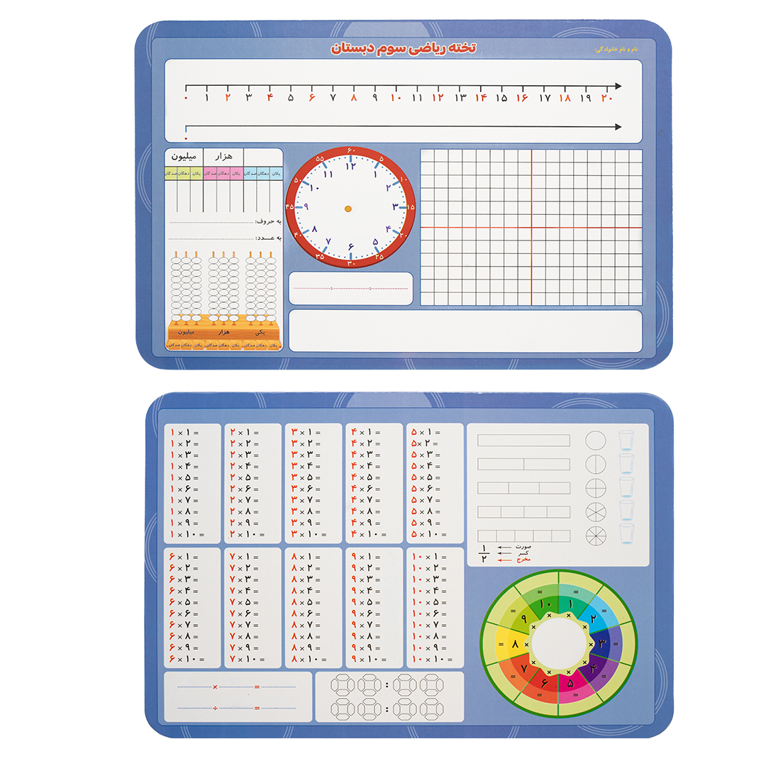 یک تخته وایتبورد آموزشی هست که روی اون تقریباً تمامی جداول و الگوهایی که برای دانشآموزان کلاس سوم ابتدایی لازم هست، از جمله یک محور اعداد، جدول اعداد ۱ تا ۱۰۰، جدول ارزش مکانی یکی و دهتایی، تساوی جمع و تفریق و تصویر یک ساعت بدون عقربه و دارای ارقام ساعتشمار و دقیقهشمار برای آموزش ساعت وجود دارد. با استفاده از این تخته، تجربه تمرین ریاضی به یک تجربه شیرین تبدیل میشه. در گوشهی تخته جایی هم برای ثبت نام و نام خانوادگی کودکان در نظر گرفته شده تا کلاس سومی ها مراقب تختهی خودشون باشن.